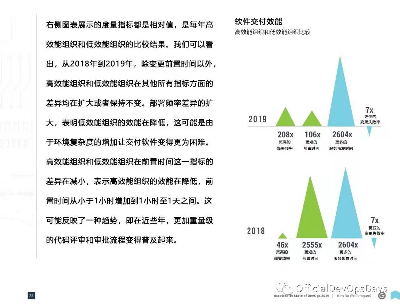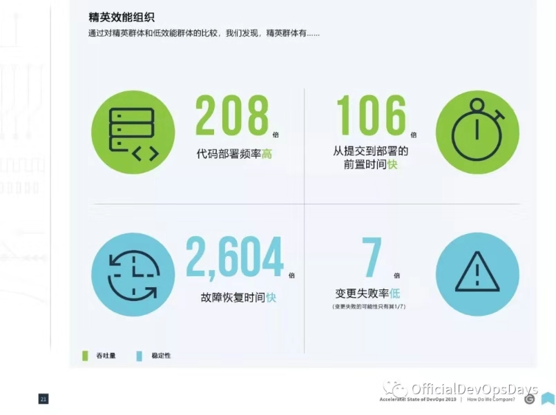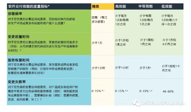 根據精英效能組織的反饋,其變更失敗率指標在0%到15%之間,而低效能組織則在46%到60%之間。取平均值的結果為,精英效能組織的變更失敗率為7.5%,低效能組織的變更失敗率為53%。這一結果說明精英效能組織在這個指標上領先低效能組織7倍。如前所述,精英效能組織和低效能組織在變更失敗率這一指標上的表現與去年相同。