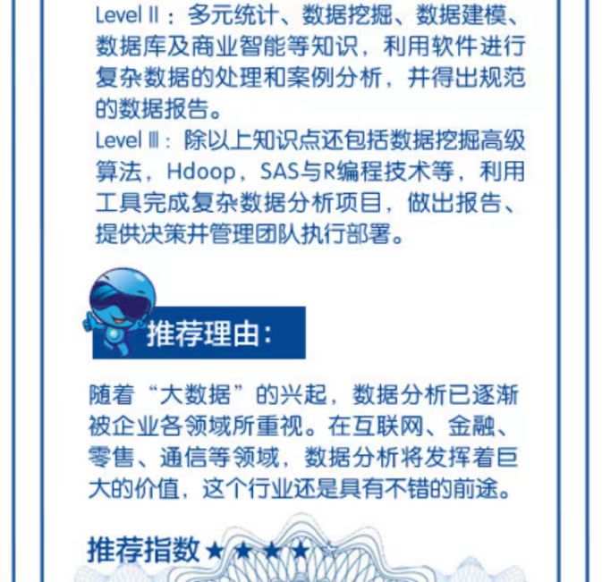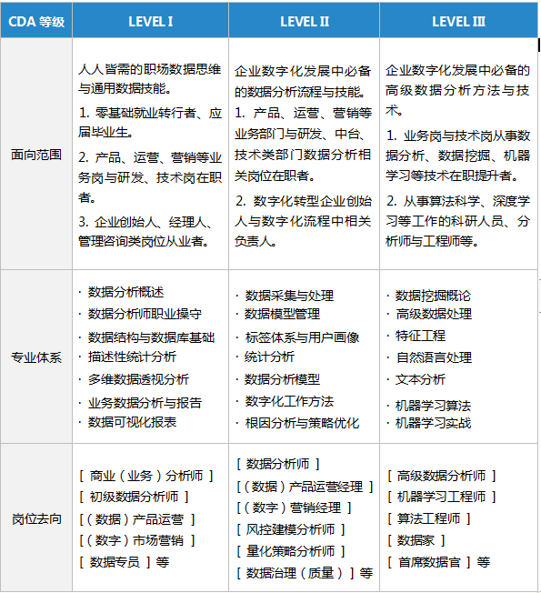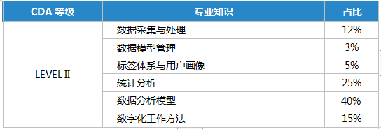 CDA Level II 包含以下科目:《數(shù)據(jù)采集與數(shù)據(jù)處理》、《統(tǒng)計分析》、《商業(yè)策略分析》、《數(shù)據(jù)治理》