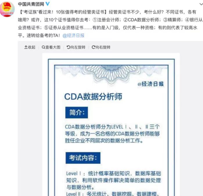 除了企業(yè)的引進(jìn)認(rèn)可 ,作為企業(yè)招投標(biāo)的重要考核項目 ,CDA 證書在市場中也得到了經(jīng)濟(jì)日報的推薦、政企大 V 的推薦,數(shù)據(jù)分析領(lǐng)域更受認(rèn)可的認(rèn)證證書。