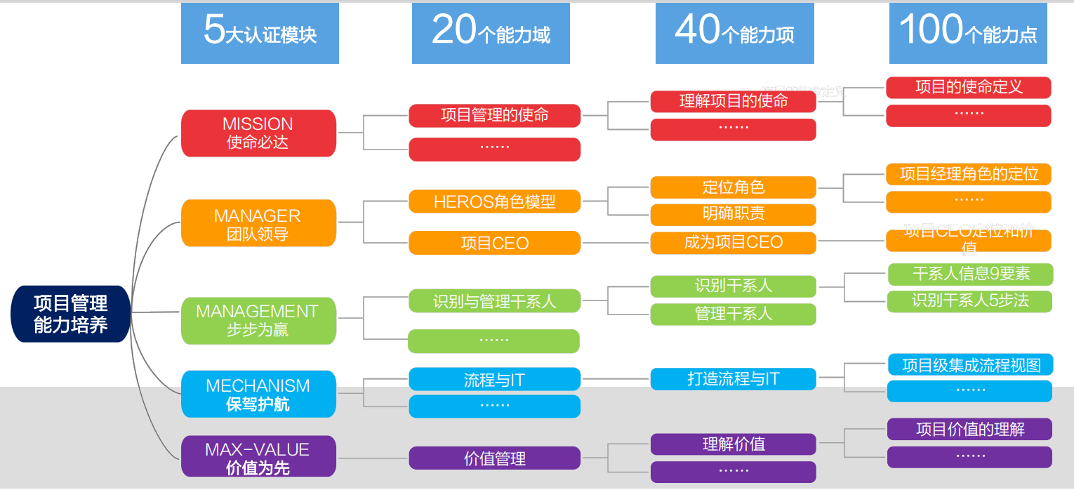 華為提煉出以能力為導(dǎo)向的項(xiàng)目管理H5M認(rèn)證模型,分別由Mission、Manager、Management、Mechanism、Max-value五大模塊組成,并依此構(gòu)建了完整的三級(jí)認(rèn)證體系。