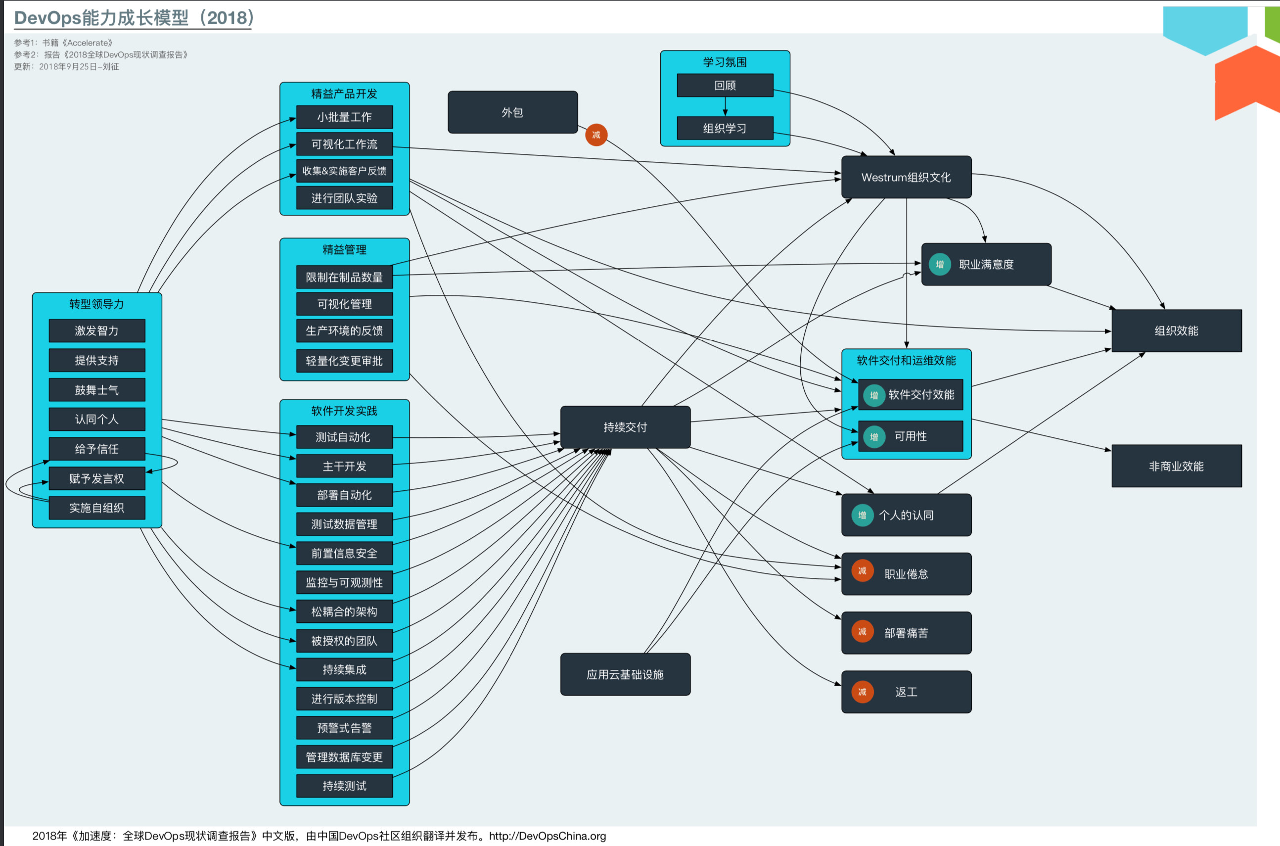 從DevOps能力成長模型中可以看出,圖中的諸多能力項都正向貢獻/預測到最右側(cè)的兩個組織級別目標,他們是:組織效能和非商業(yè)效能(商業(yè)和非商業(yè)目標),它們是: