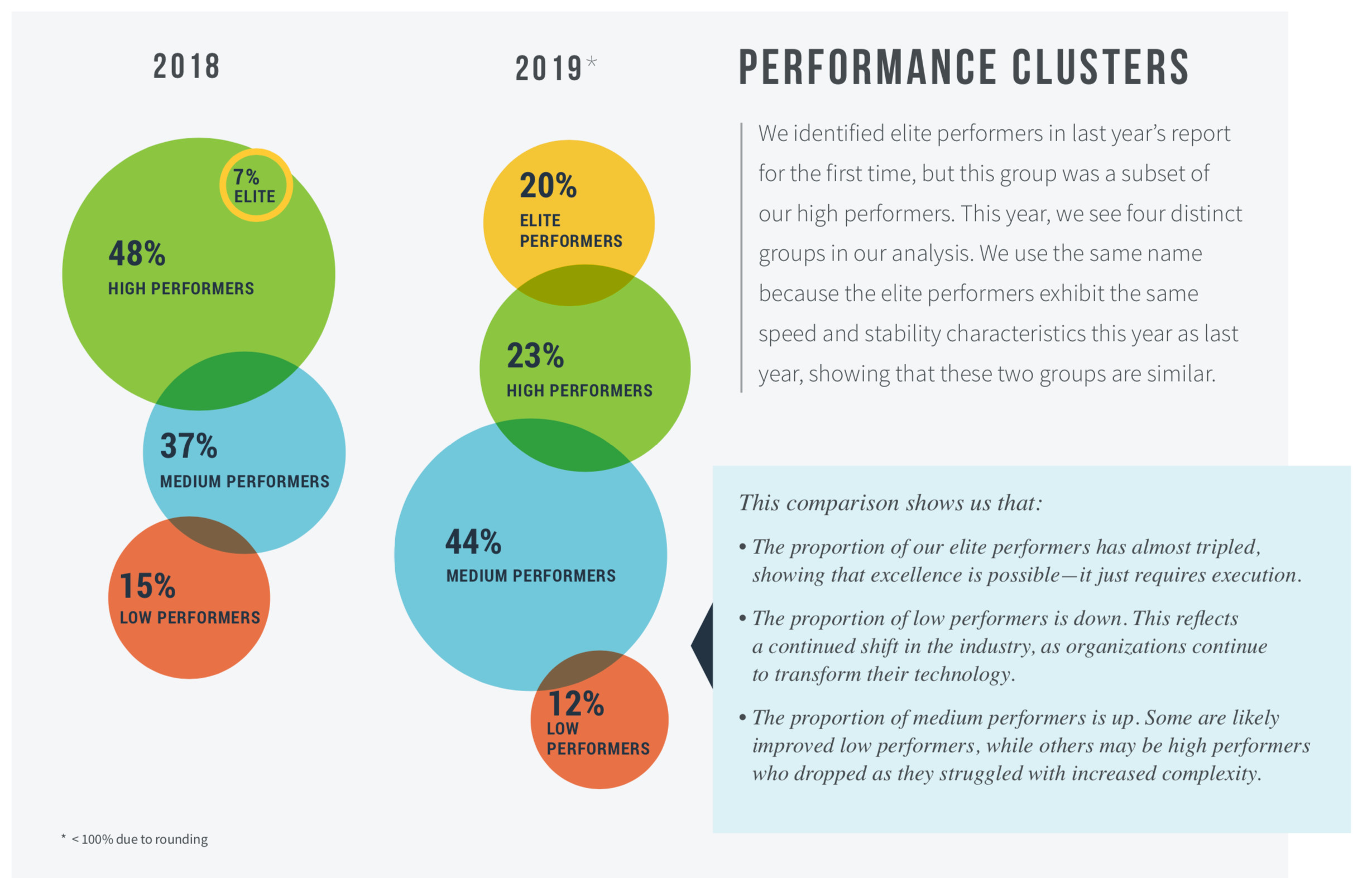 在這個泡泡圖中,我們可以看到有多少比例的受訪者處于精英、高效、中等和低效的陣營。復述一下今年的一個重大發(fā)現(xiàn):精英表現(xiàn)者已經(jīng)從去年的高效能表現(xiàn)者集團中脫穎而出,他們在指標的絕對值和總體數(shù)量上都增長迅敏,增長率高達將近3倍?!綝evOps教練點評:回顧一下這份報告的標題中加入的加速度的關鍵字,一旦某個組織的實施方法得當,一個持續(xù)優(yōu)化的組織的整體效能就可能做上火箭,加速度的飛離地球。而加速度不足的企業(yè)則處于持續(xù)跌回地面的窘境?!?/span>
