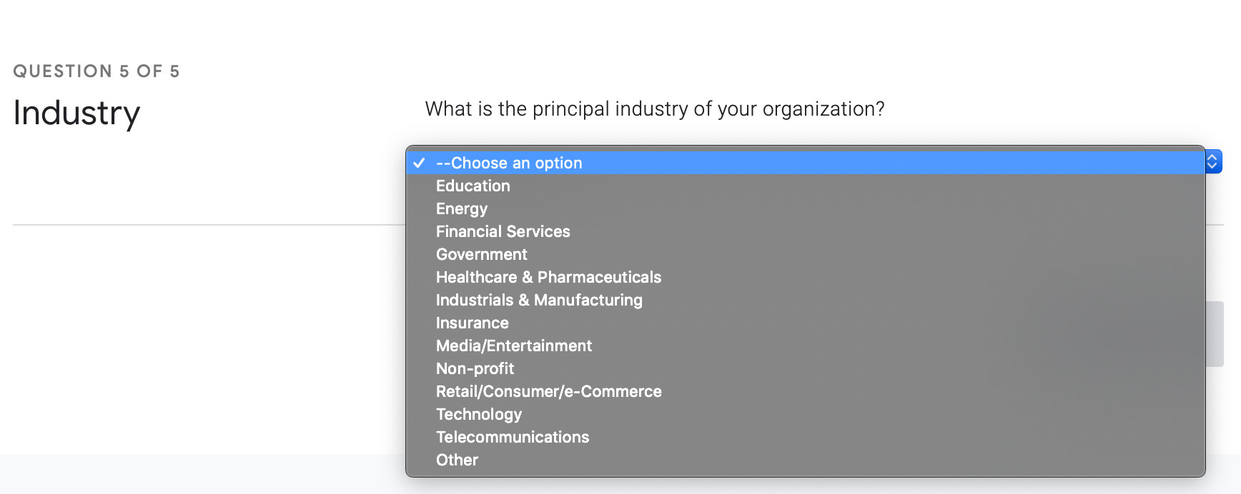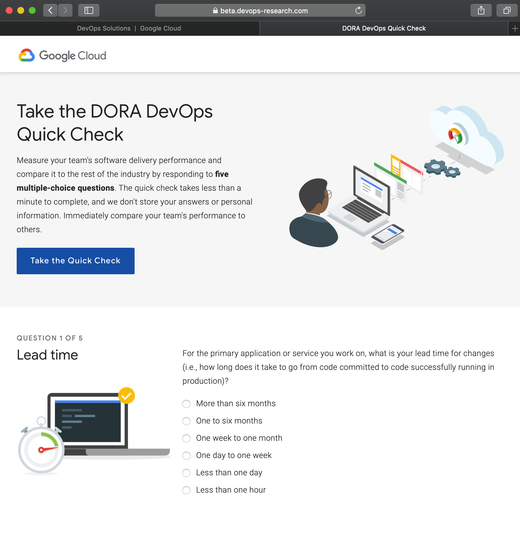 這可能是Google收編DORA團隊所買到的最有價值的一部分資產(chǎn),歷年來的DevOps調(diào)查問卷參與者的問卷答案數(shù)據(jù)庫。Google今年將這個數(shù)據(jù)庫向公眾開放了,網(wǎng)址在 https://beta.devops-research.com/performance.html (這個網(wǎng)址應該不用科學上網(wǎng),會出現(xiàn)證書錯誤提示,請忽略繼續(xù)訪問該頁面)。在你回答了下面的五個問題后,就可以獲得一份自己的行業(yè)基準測試報告。