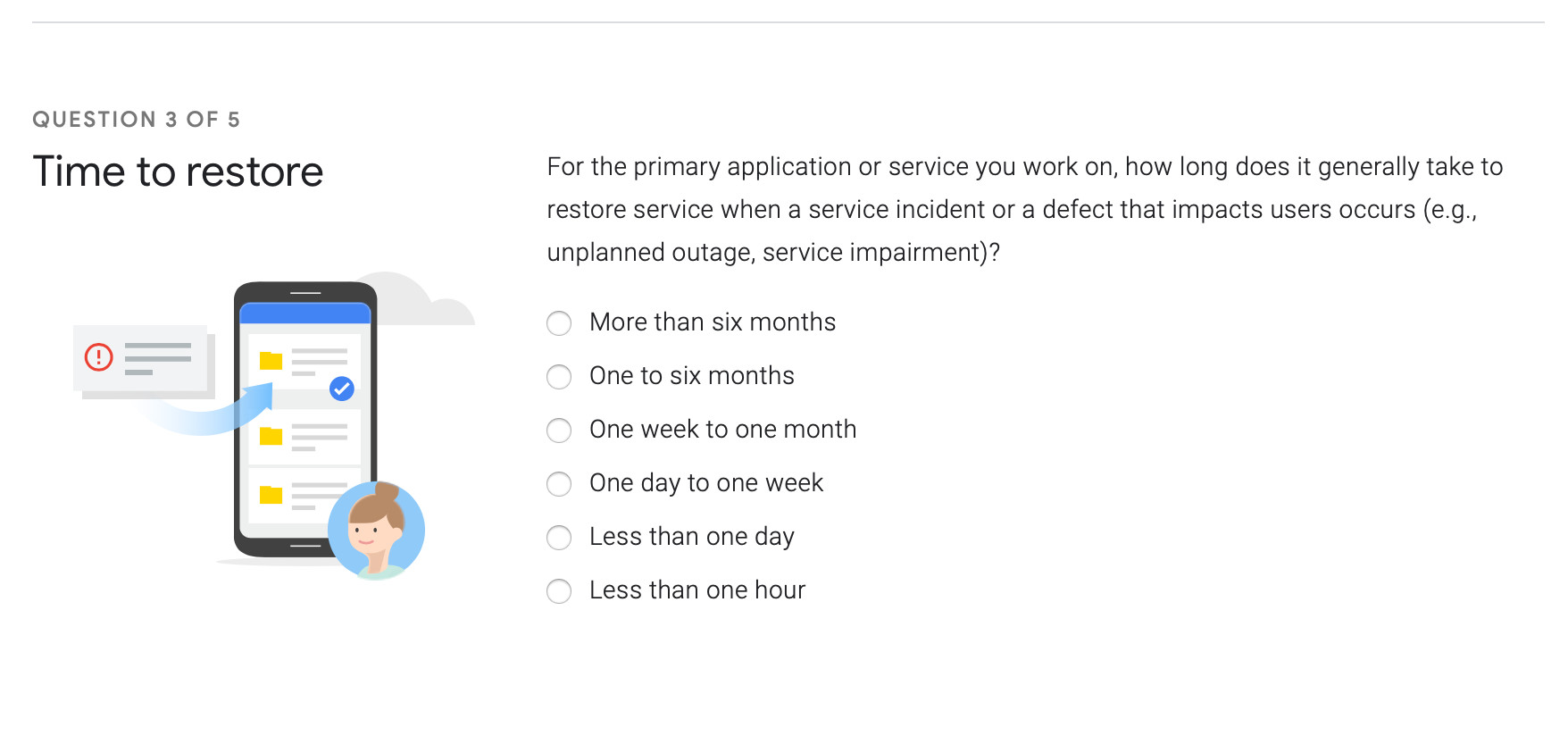 穩(wěn)定性–服務恢復時間: 對于您工作的主要應用程序或服務,當服務中斷或出現(xiàn)影響用戶Bug時(如:計劃外中斷、服務受損),恢復服務通常需要的時間。調(diào)查這個指標的問題見2019年加速度DevOps狀態(tài)調(diào)查問卷中的第二部分的第四題。