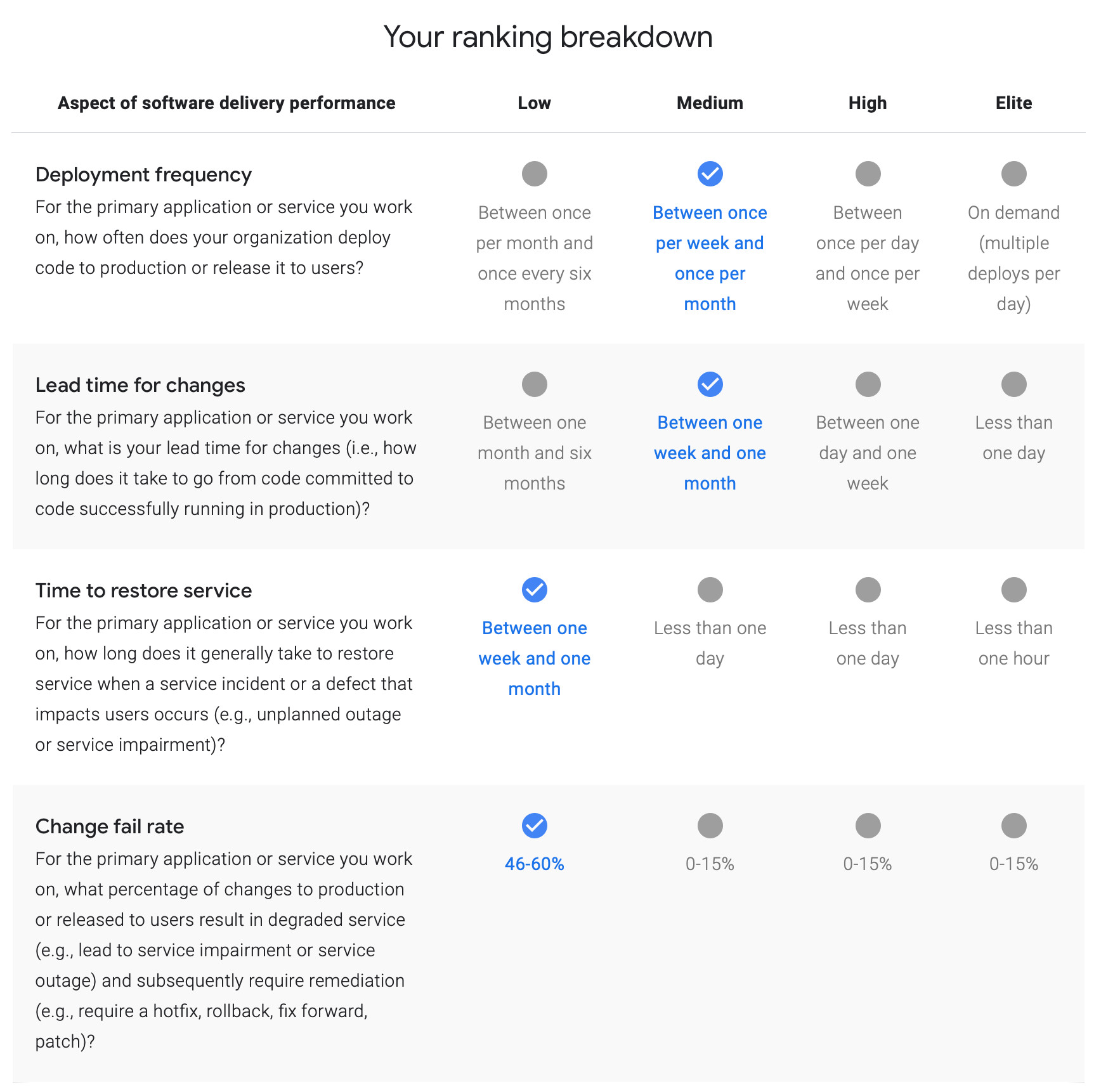 下圖是四個黃金指標在四個表現(xiàn)級別/集團上的度量;表明你每個指標處于哪個等級。