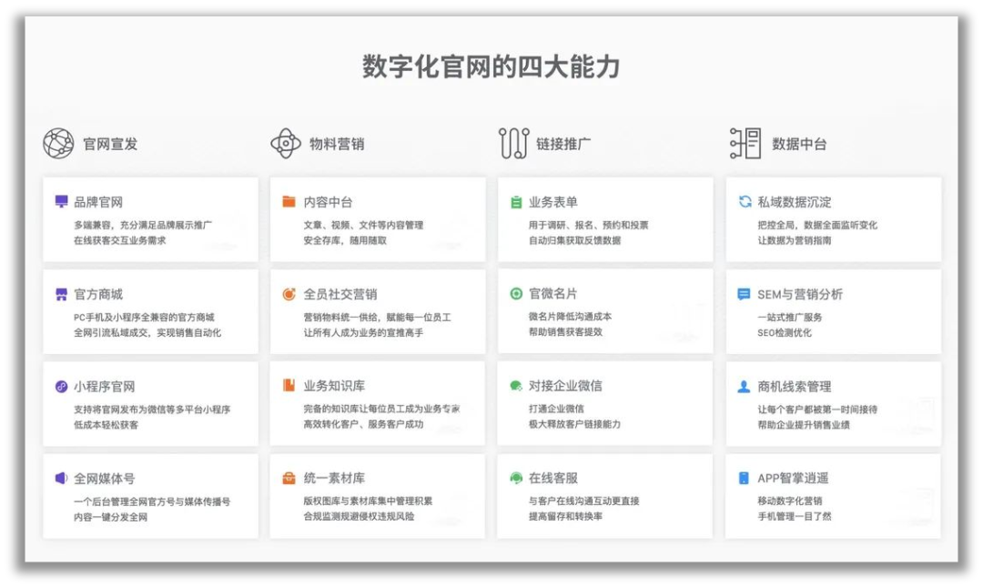 從對(duì)外獲客上,數(shù)字化官網(wǎng)所具備的獲客與數(shù)據(jù)能力,天然就滿足數(shù)字化轉(zhuǎn)型以提效降本與智能決策、內(nèi)容營銷為重點(diǎn),線上線下融合為方向的要求。
