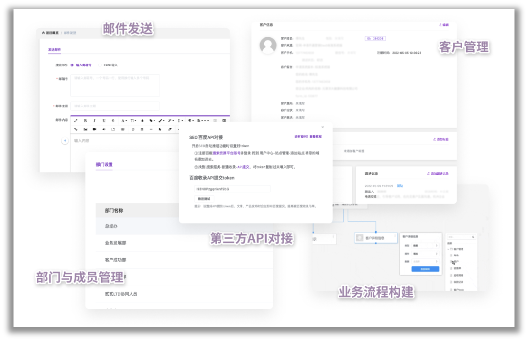 而對(duì)內(nèi)管理部分,與企業(yè)微信內(nèi)建了一些常用的比如OA功能類似,數(shù)字化官網(wǎng)也內(nèi)建了內(nèi)部業(yè)務(wù)使用的客戶管理、組織管理、企業(yè)資料管理等能力。