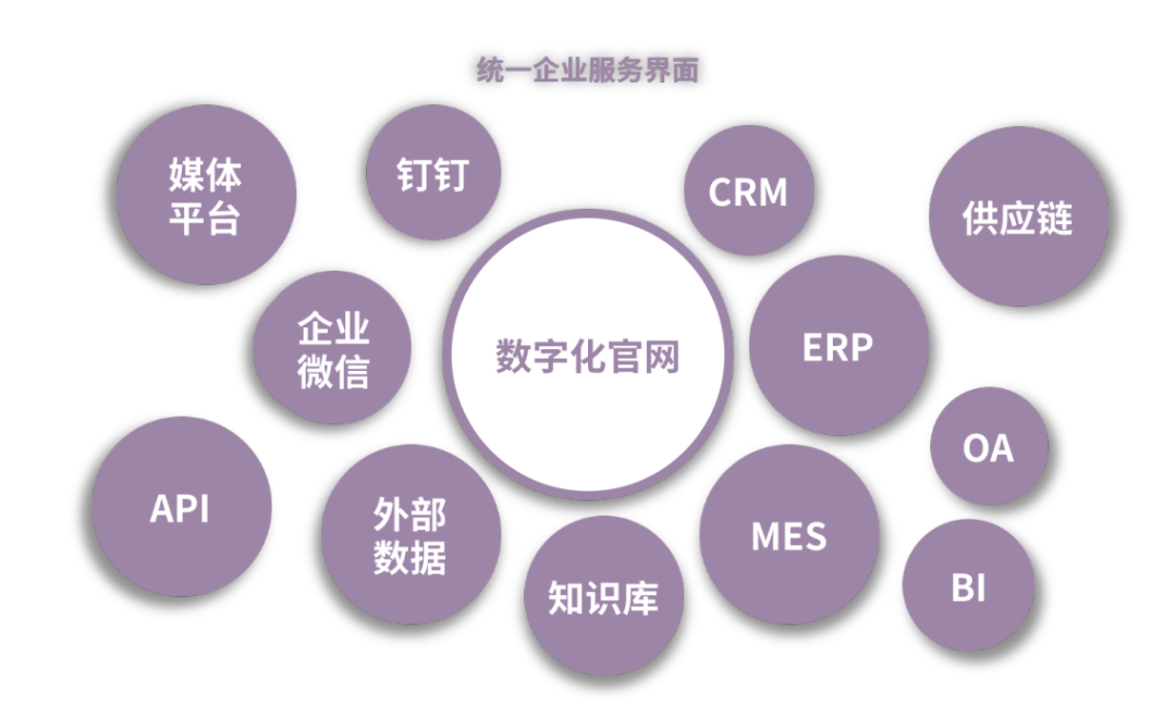 除此之外數(shù)字化官網(wǎng)的「Hub」屬性,可以作為企業(yè)數(shù)據(jù)中樞,通過低代碼、無代碼、API的形式,快速接入并構(gòu)造企業(yè)的信息流程。通過數(shù)字化官網(wǎng),實(shí)現(xiàn)「統(tǒng)一企業(yè)服務(wù)界面」,外部以客戶為中心,內(nèi)部以員工用戶為中心。數(shù)字化官網(wǎng)對(duì)外獲客對(duì)內(nèi)管理的本領(lǐng),令其具備了作為數(shù)字化轉(zhuǎn)型系統(tǒng)的條件。
